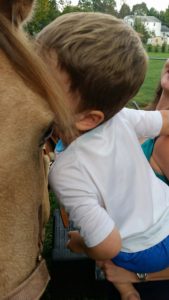 Kisses for Deliliah September 19, 2017 This little guy wasn’t quite brave enough to actually RIDE Delilah, but he WAS brave enough to dull out some kissed for her! awwww……