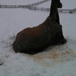 Here’s a whole new way of washing horse blankets. Just train your horse to roll in the snow on command!