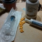 Lately it seems all the animals are needing prescription medications. Here are all the drugs I dish out in the morning these days…..3 drugs for poor Cartwright and 1 for Alex.