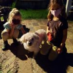 The sweltering heat didn’t stop these girls…they came for a visit to groom, Delilah and take Maverick for a walk. Then of course they had to see the new tractor…..