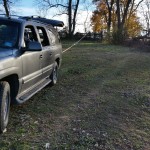 The second big tree is tied to the Suburban in order to coax it in the direx we want it to fall. Well, not EVERYTHING went according to plan. Shucks.
